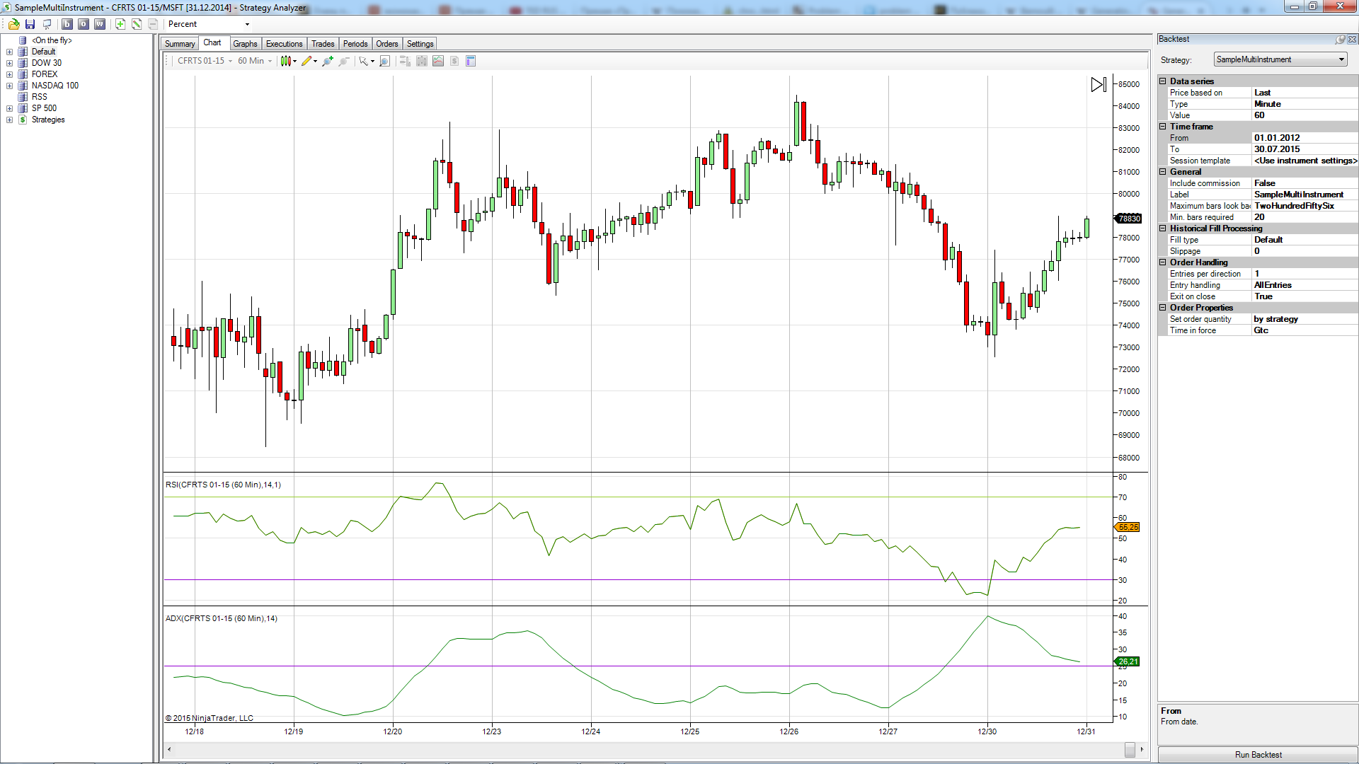 For example, let's look at backtest window of SampleMultiInstrument strategy(see in the attach). We see three panels: one for the price series and two for indicators.