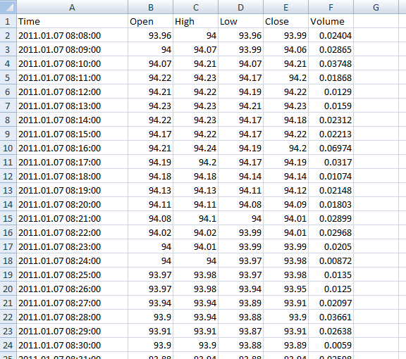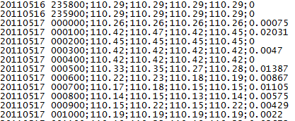 yyyyMMdd HHmmss;open price;high price;low price;close price;volume