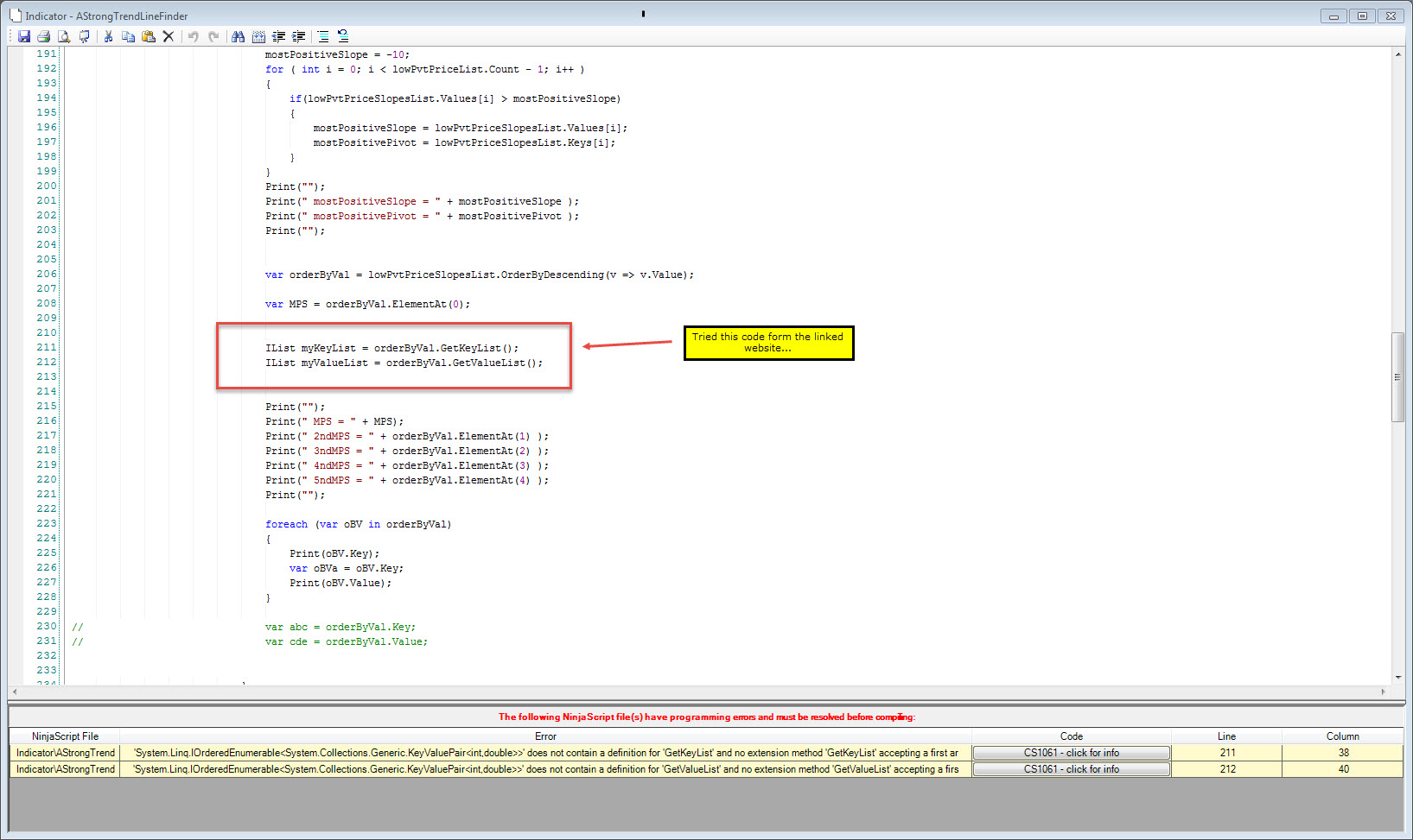 I'm now trying to sort the sortedlist that contains the slopes but having problems on how to do that. I have found the following as an attempt, but this code doesn't even compile.(This method is found on line 261 in the attached code: AStrongTrendLineFinder)