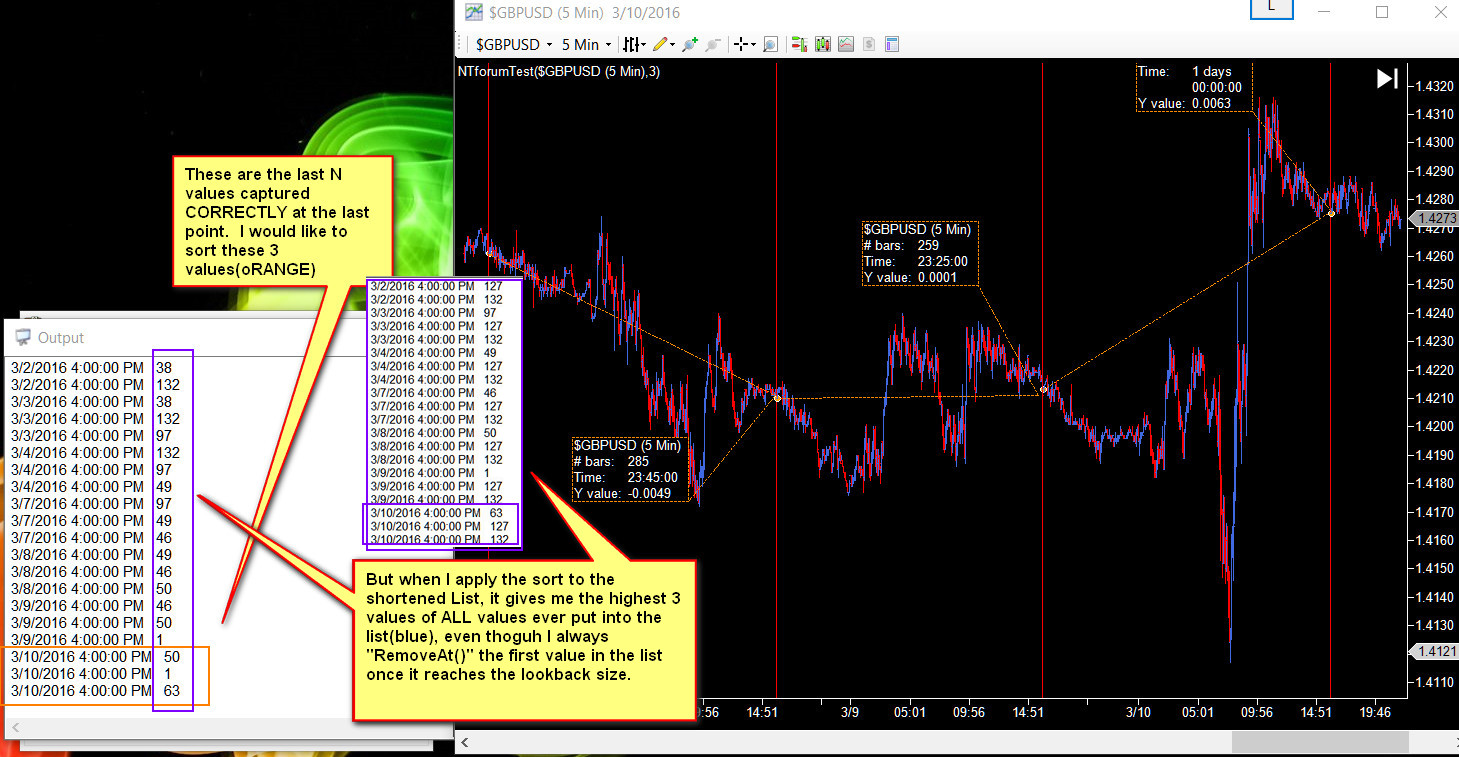 The problem is that when I use the .Sort() function, it doesn't sort the new copied List, but rather seems to sort ALL values i have added to it. It is weird b/c I can see that the new list gets created with the proper values and will show the last N number of values. But when I apply sort to it, it suddenly shows me a sort of the highest values that where ever captured in the list? But they should be gone as I use List.RemoveAt(0) which should be removing them completely.