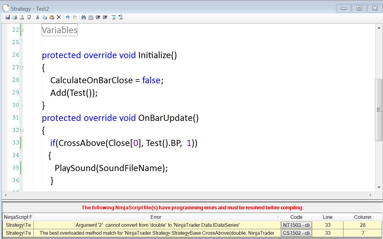OK, so now using strategy instead of indicator to access Test.cs and bp value and create my alert. I have a couple problems, one is shown on the attached picture.