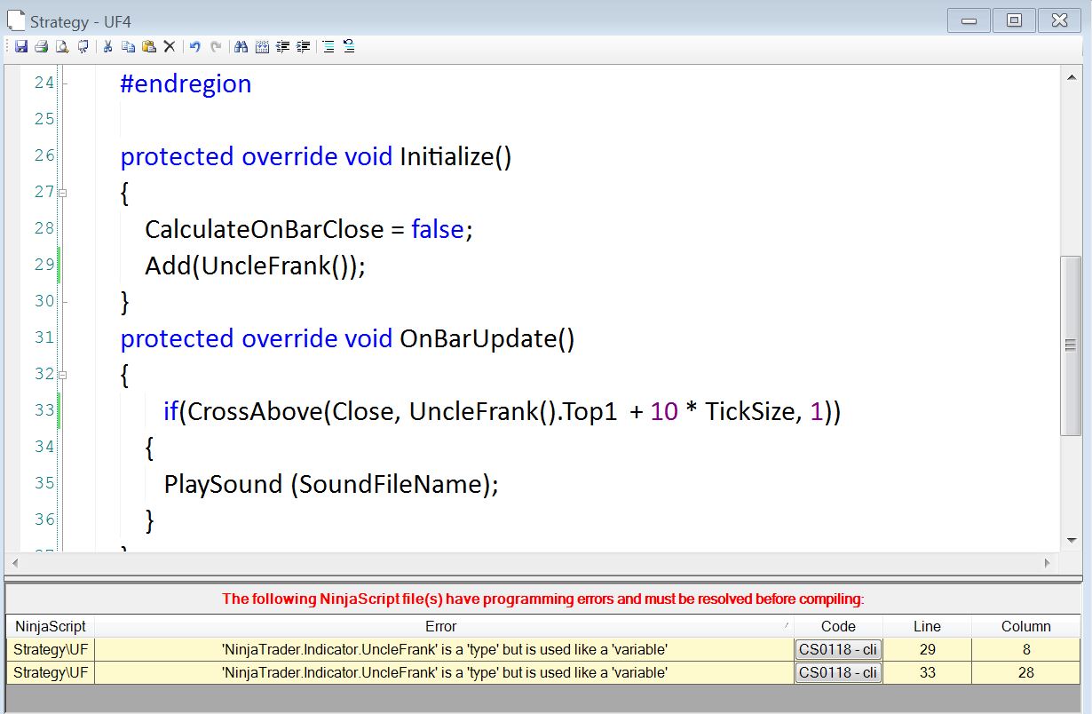 In my main program, as opposed to the test program, in its strategy when I "Add(UncleFrank())" under initialize for example I get the error message "NinjaTrader indicator Uncle Frank is a type but it is used like a variable"