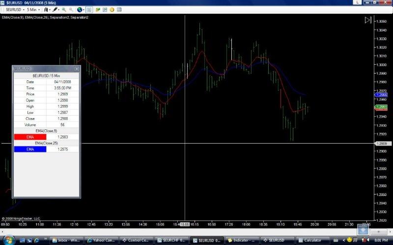 It should check to see the separation between the two EMA lines, that is EMA 9 minus EMA 25 is greater than or equal to 8 pips for a long and EMA 25 - EMA 9 is greater than or equal to 8 pips for a short. If the previous bar the separation was less than 8 pips and on the current bar the separation is greater than or equal to 8 pips then color the bar.