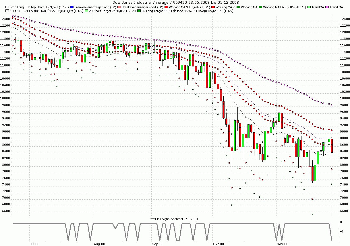 3. close-atr(21) = Stop for Longs shown if 1-2a are positiv (greater as 1 before) (dots)