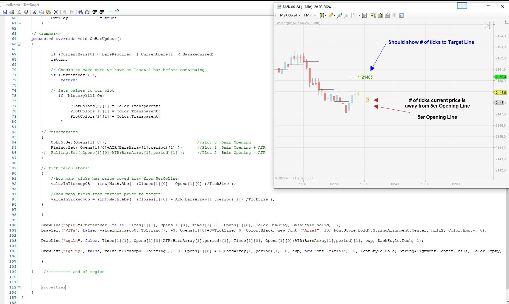 I am stuck and hope someone can help me. What I am trying to have the indicator do is to show the number of ticks to a target line which is drawn using the ATR. This is for NT7.