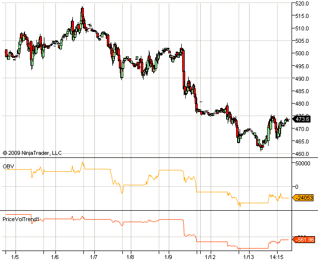 This is very similar to OBV (On Balance Volume) as shown the chart below and the attached indicator. Instead of accumulating the up or down volume in OBV, the PVT is multiplying the volume by the Price rate of change.Originally posted by warrior View PostHi, is Price Volume Trend (PVT) indicator available for Ninja?