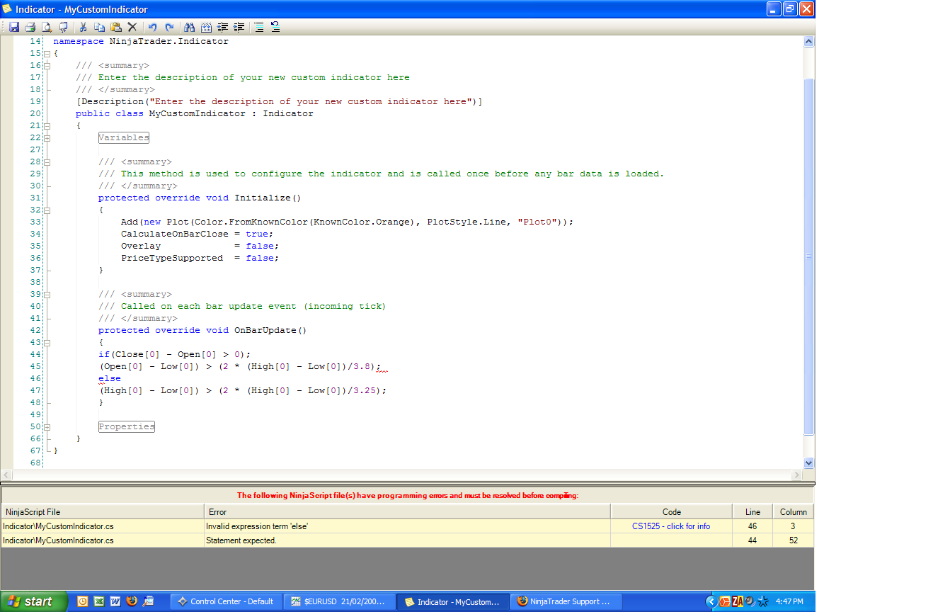 I have downloaded the Demo Version (love it) and would like to convert a code I developed in Metastock into a NinjaTrader indicator so I can overlay on a chart.