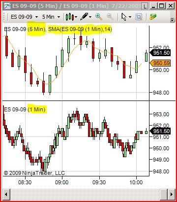 This screenshot is a quick example of how NT7 can plot not only two series at once, but also how indicators can use data from other data series. The top series (ES 5M) has a SMA plotted on it that uses information from the 1M ES series.