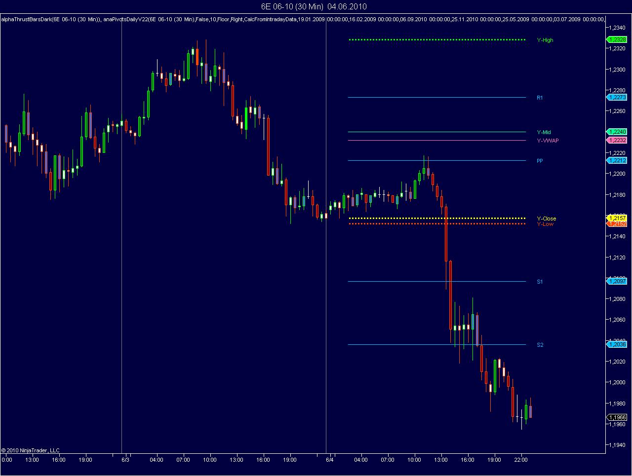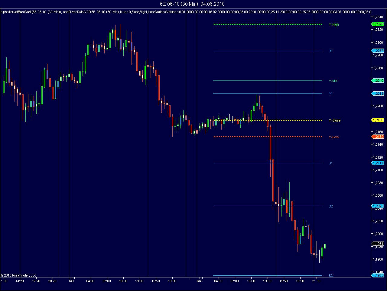 Now the trouble begins with those instruments, where the calculation period for the settlement price and the end time for the session differ a lot. For example the calculation period for all FX Futures is between 13:59:30 and 14:00 CT. But the session ends at 16:00 CT, leaving us with 2 more hours of trading, in which we can easily make new highs or lows and close prices. This of course leads to wrong pivot points. I checked it with a session template where all end times were set to 14:00 CT. This usually led to absolutely right pivot points in the last days. But in some cases there was still a lot of market movement between 14:00 CT and 16:00 CT, which led to wrong pivots. And of course, using this session template, I’d cut off 2 hours of trading in the charts, that could be important. It is even worse with Eurex instruments, since their calculation period is usually about 4.5 hours from the end time of the session, so that one can’t just cut off 4.5 hours just in order to get the right pivots. So this is not a sustainable solution.