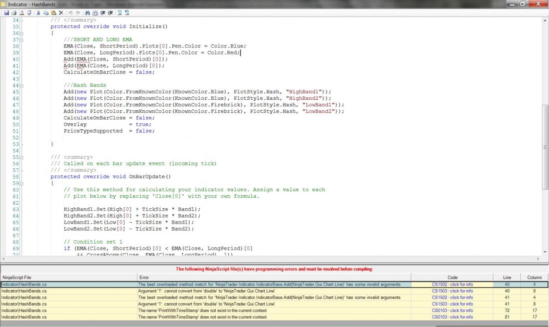 The way you use the Add method here isn't supported for version 6.5. You need Add to create additional plots, but you're using it in an attempt to add EMAs. I would take a look at some of the built in indicators to see how add is used to add plots(plots are placeholders for values), and then the calculations are "Set" in the OnBarUpdate() method.