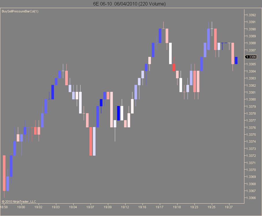 Its just a simple modification to NT's own BuySellPressure indicator. It colors the price bars in a graded way with White as equal Bid and Ask trades. The more trades at the Ask, the Bluer the price bars get, the more trades at the Bid, the Redder they get.