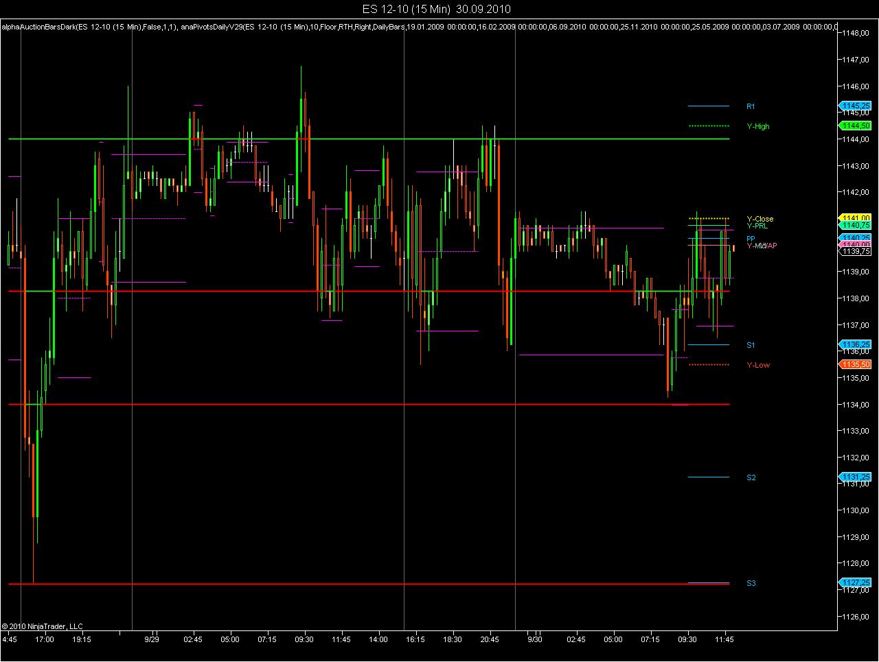 Displays floor pivots (options wide/ narrow), woodies, camarilla, fibonacci or (next release) jackson zones. Can be set to ETH/RTH, pivots can be calculated from settlement or close. Includes weekly and monthly pivots.