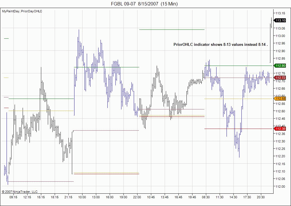 The lines are not matching at all , today is 15th-August, the lines are plotting 13th-August OHLC not 14th-August (which is previous day).I put on that chart also an indicator which plots (blue color) the bars of the entire intraday session every couple of days, so you can see the whole 14th session' bars as blue, last 2 bars of that chart are the first 2 bars of today session (15th). It should be clear the indicator PriorOHLC is not plotting the correct values. To show the correct values , I have to reapply the indicator as soon as there are at least 2 bars in today's session. As I explained in my first message if the indicator is already on the chart at current session opening it will plot the wrong values .