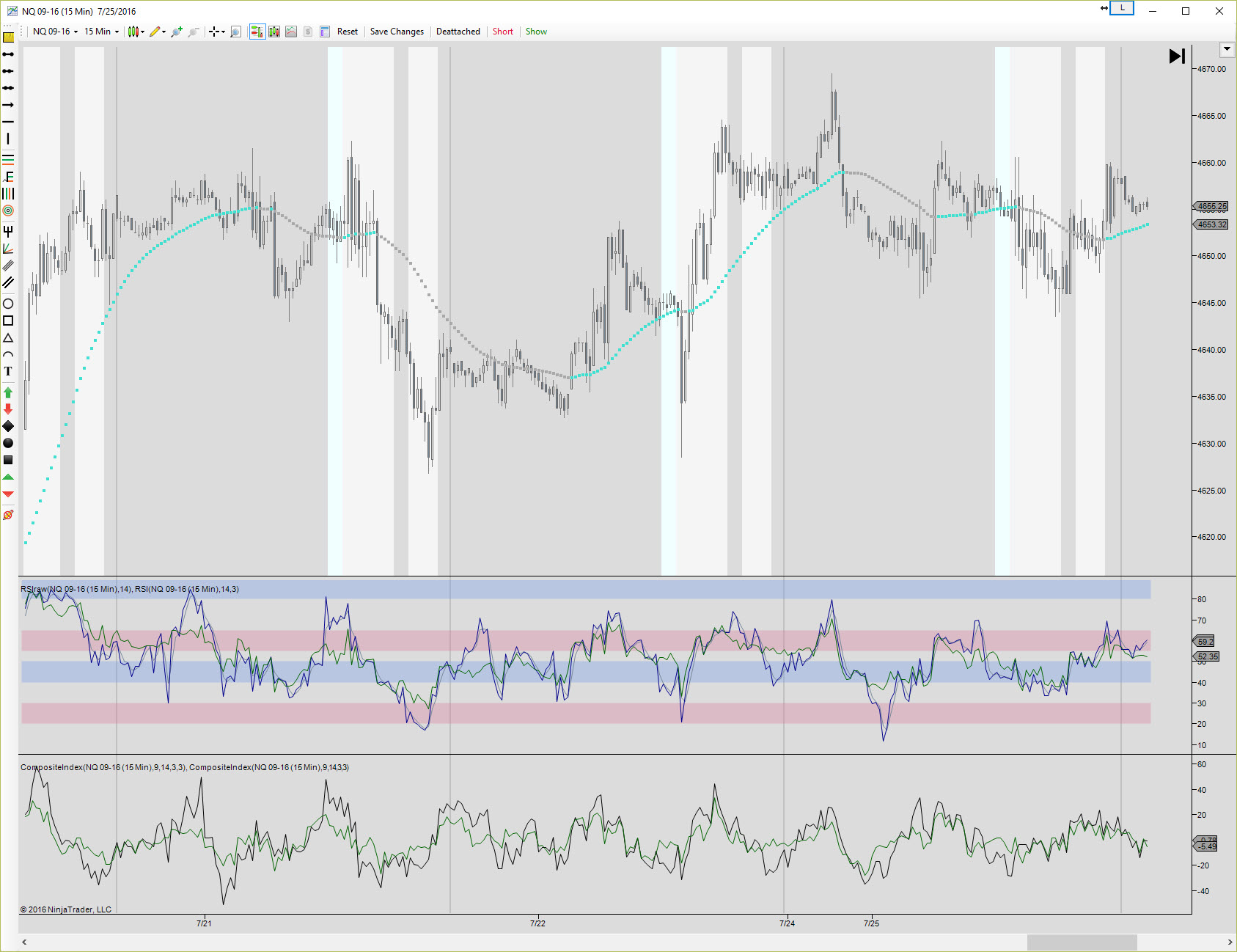Attached is a random chart that shows the original Wilder 1978 calculations plotted in Black/Blue, but the smoothed Ninja calculations plotted in Green. Compare the character, range, angles, divergences to the charts in Constance Brown's books and see if you see the same issue.Last edited by cpuzz; 08-01-2016, 08:23 PM.