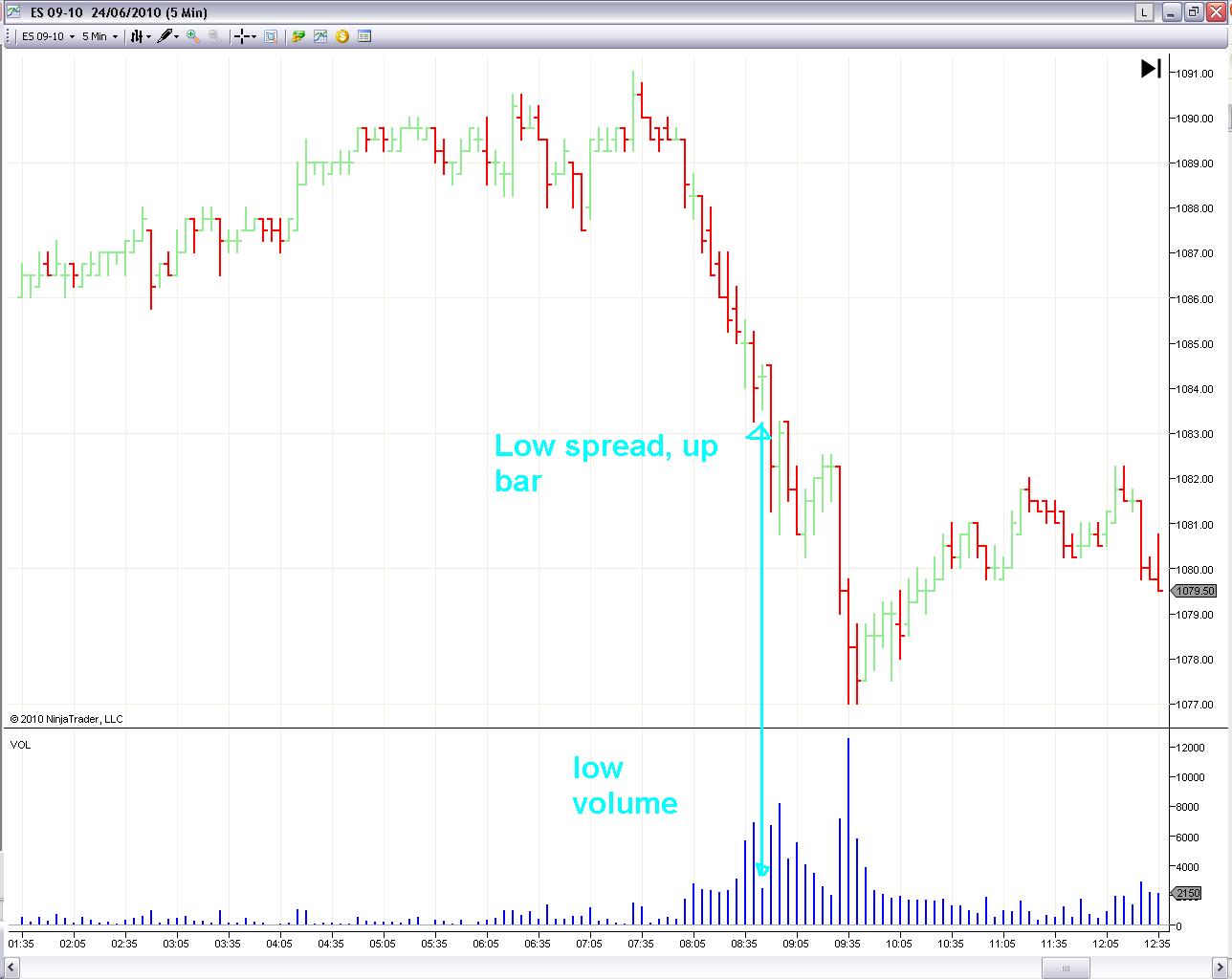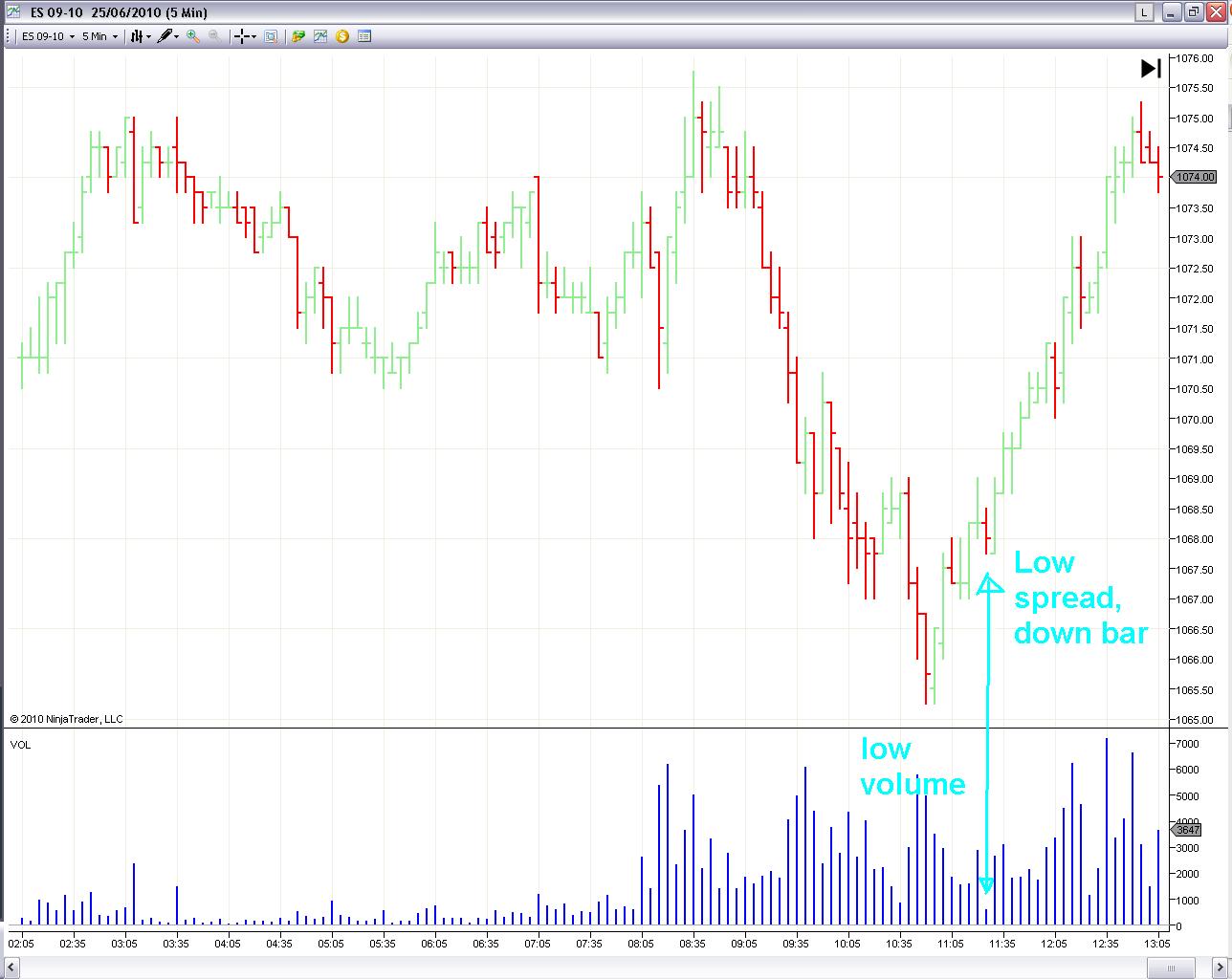 Down bar, low spread, low volume.