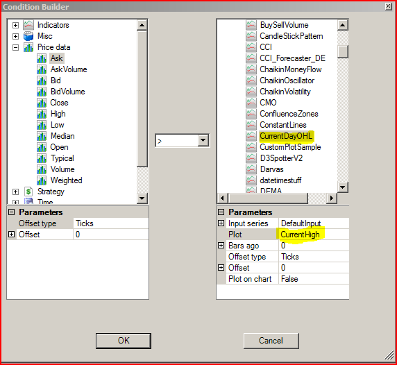 rknatty, I believe I just replied via email to your question, but you can use the CurrentDayOHL indicator with the CurrentHigh plot for the day's high (the screenshot shows the ask price being compared to the current high), and CurrentLow for the day's low.