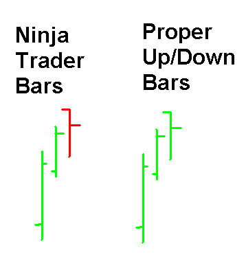 Ninja Trader Bars show the third bar (in red) to be a down bar because it closed below its open BUT what it is supposed to be is an up bar because the close closed higher than the previous close - the opening price is irrelevant.