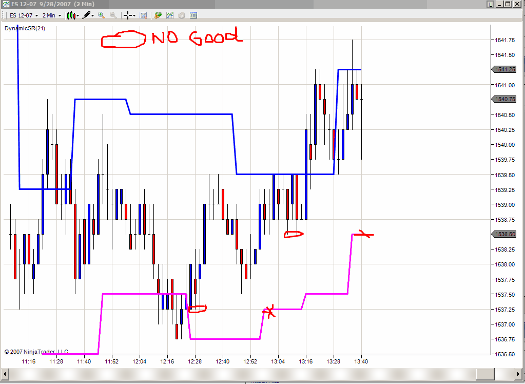 The general usage guidelines in this post is how I use TRO's Dynamic S/R. In real-time its much harder to discern how to act on new highs/lows, but that just comes with experience on watching particular instruments. The idea is for a quick scalp not major movements. Also it seems to work better on volatile stocks. Hope that helps.