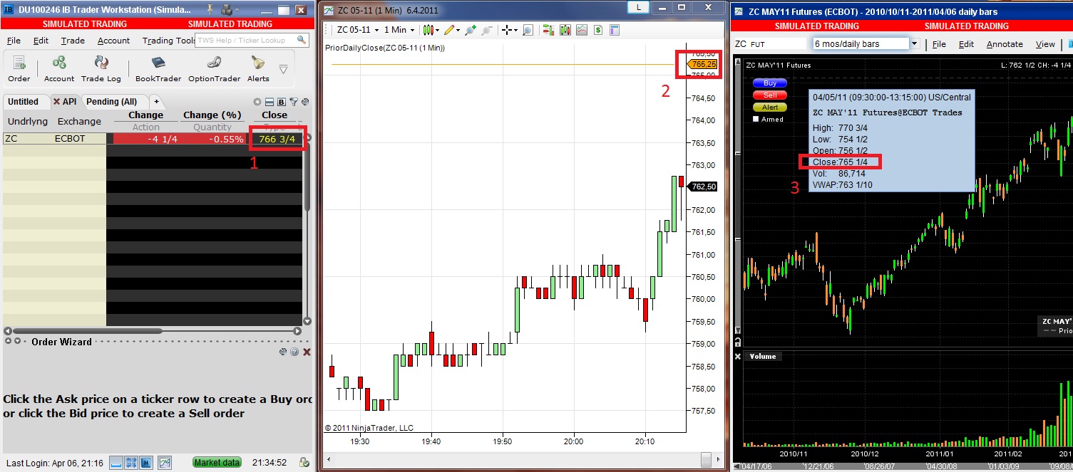 Thank you very much for a tip. Unfortunately this method does not return expected value. It returns the value which is shown on a day bar chart as a close value but it is not the "real settlement" value from which the price limit for the next day is calculated. For example on 3th of April on ZC market real close day value was 736 and this method returns 732,5 which the value shown on a chart.