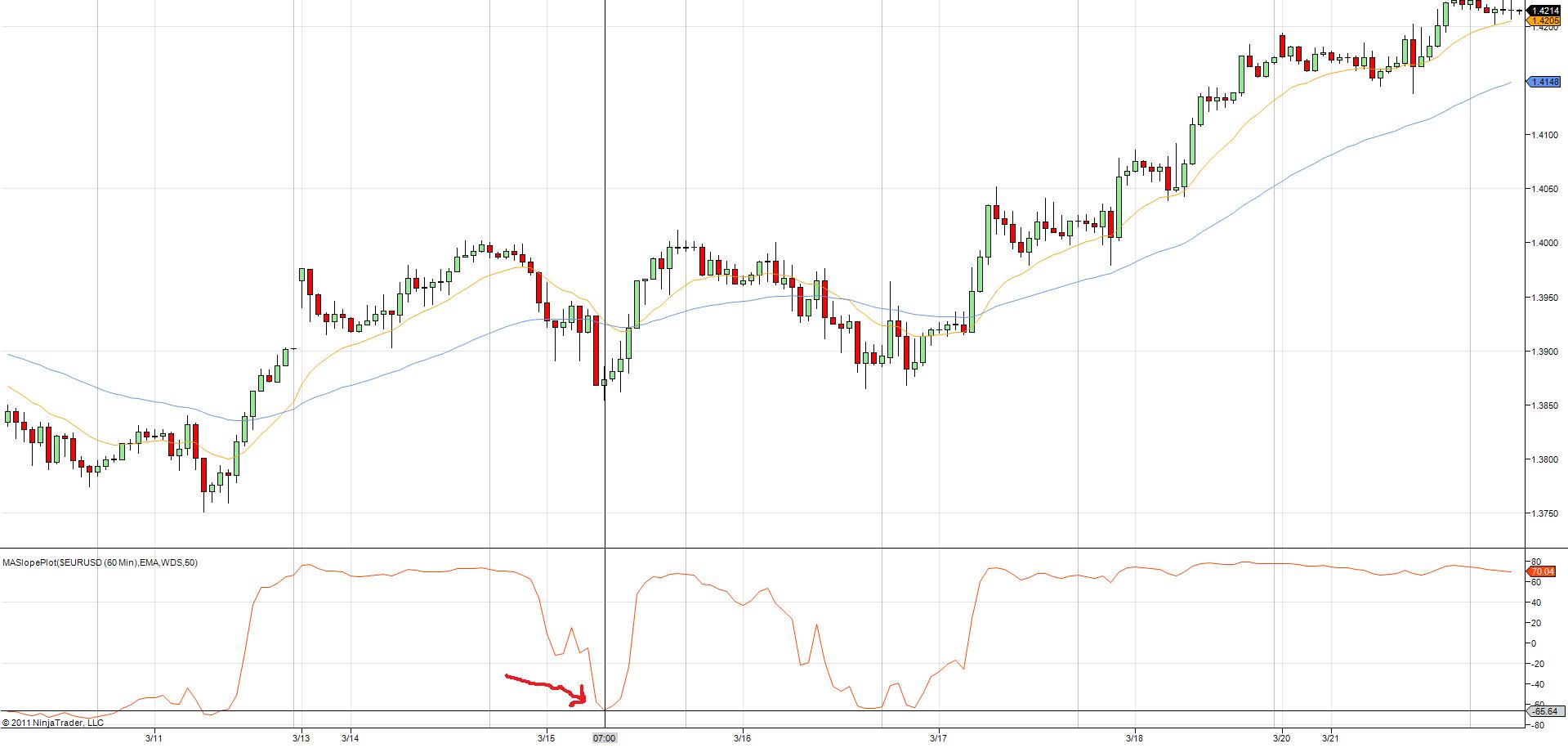 I've attached a screen shot of what i'm talking about. As you can see, in light blue, the EMA 50 is plotted on the chart and at 7:00 on 3/15 it is obvious the slope of EMA 50 is positive... but MASlopePlot is showing a value of -65.64? I can see where it tracks very closely the slope of the candles above it, but what's the deal with the EMA 50 then?