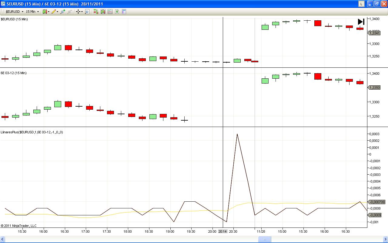 attached you could see a chart with two instruments and an indicator plotting the difference between both instruments prices, also you can see there is a gap on second instrument that was casued (I supose) by not been a traded instrument at that time.