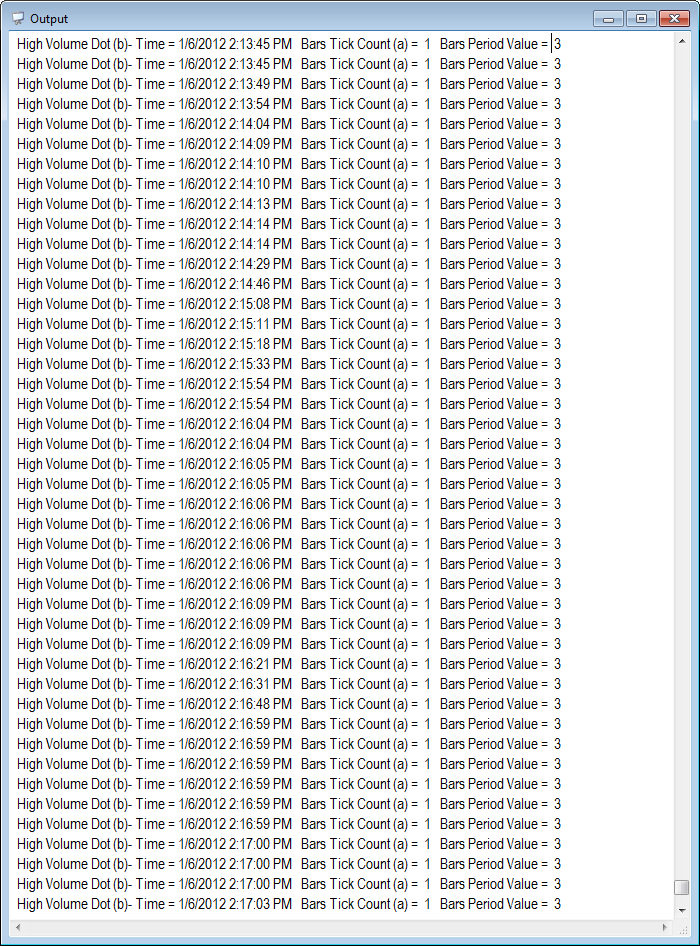 Print(" High Volume Dot (b)- Time = " + DateTime.Now + " Bars Tick Count (a) = " + Bars.TickCount + " Bars Period Value = " + Bars.Period.Value);