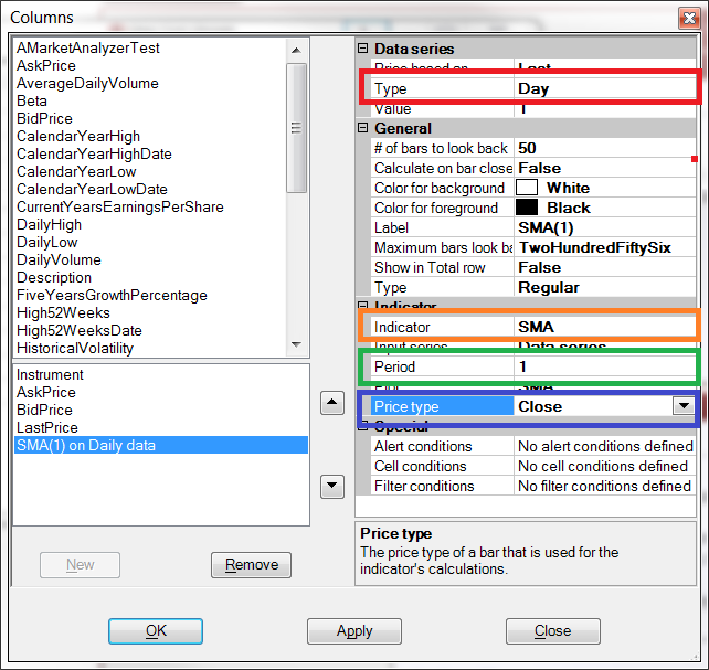 I'm using the Kinetick EOD (free) as well since there's a problem with TDA.dll. How do I pull the daily close price on the Market Scanner? My indicators will fill their value correctly, but I can't find a field for "daily close" listed under Columns.