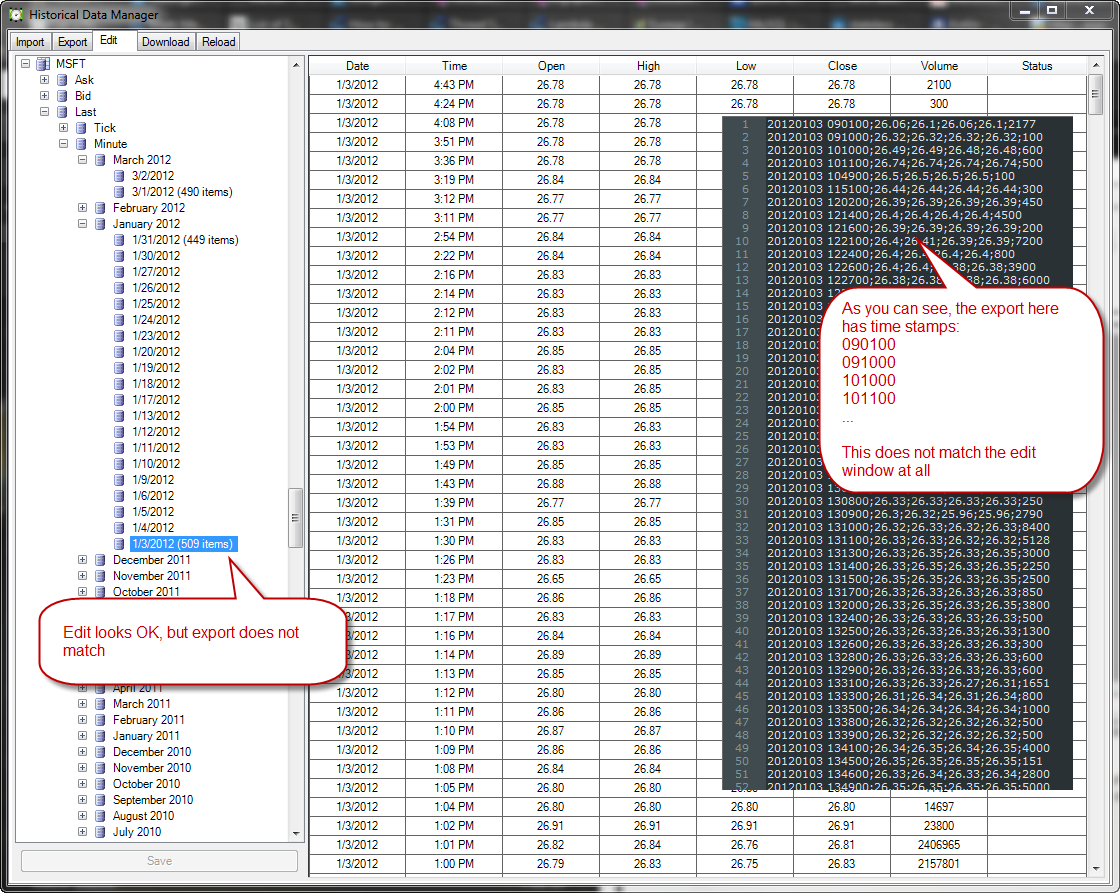 Here's a screenshot showing MSFT for 1/3/2012 alongside the exported data for the same day. You can see that they do not match at all...