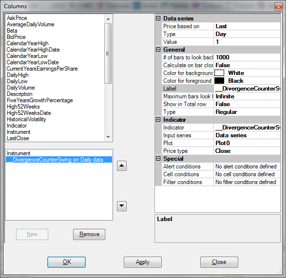When I add the indicator to a daily chart with 1000 bars, it works fine and I get the value plotted back. However, when I add the same indicator with the same exact setup into Market Analyzer, I don't get any results back (zeroes plotted throughout). Interestingly, when I make the "number of bars to lookback" = 10,000, the indicators start plotting in Market Analyzer. Even then, some of the indicator values don't match what I get plotting it on the daily chart with 10,000 bars included.