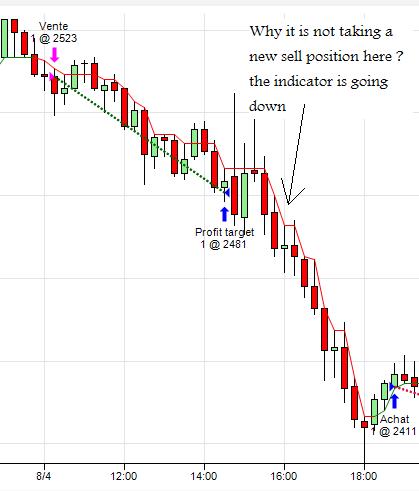 but i don't understand why after hitting 42 ticks, the indicator continue to go down and the script is not taking a new position (as shown on the picture below).
