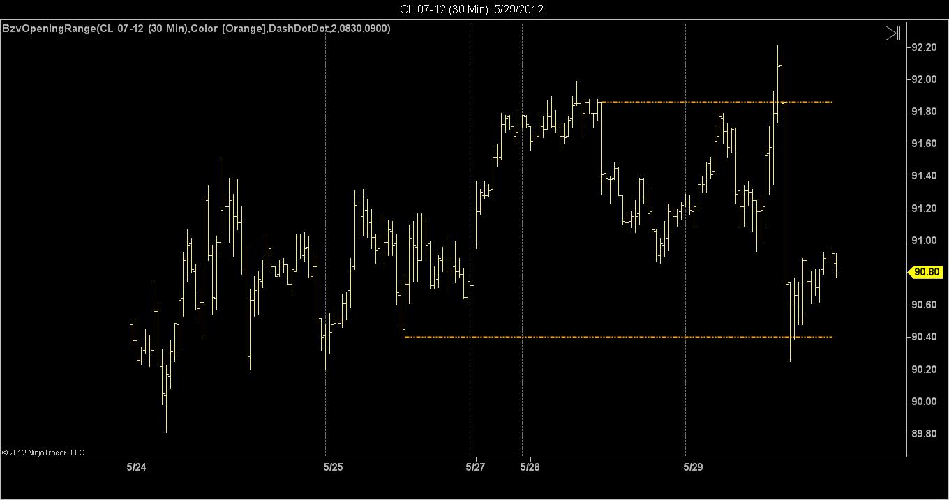This sounded like a nice little exercise, so I threw one together. I have seen better choices discussed in the forum, but here's a simple little Opening Range indicator that lets you set the session open time and the range end time, so you can specify the exact time range you want to see the high and low of. It draws lines at the high and low of that range. I only tested it on tick and minute charts. Time frame of chart must support the range selected.Originally posted by mtom4 View PostDoes anyone have an Open Range indicator they could share with me? The indicator posted in the Version 7 Indicators section doesn't seem to work.