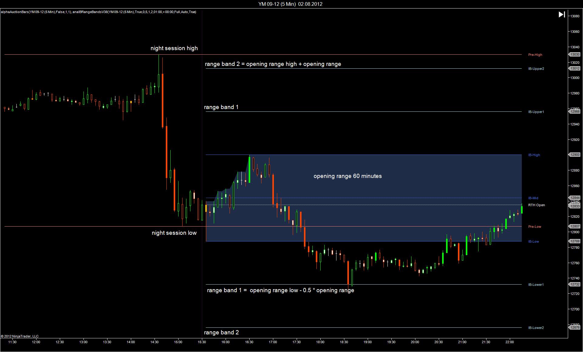You will find another free indicator here: It plots the opening range, the pre-session high and low and the range bands calculated from the opening range. The chart shown uses a segmented session template - daily session split into night session and regular session - , but the indicator will also work on regular session templates, when the offset is adjusted.Originally posted by JerryA View PostWas looking all over for an opening range indicator that worked! This works great. Thanks for writing the code.