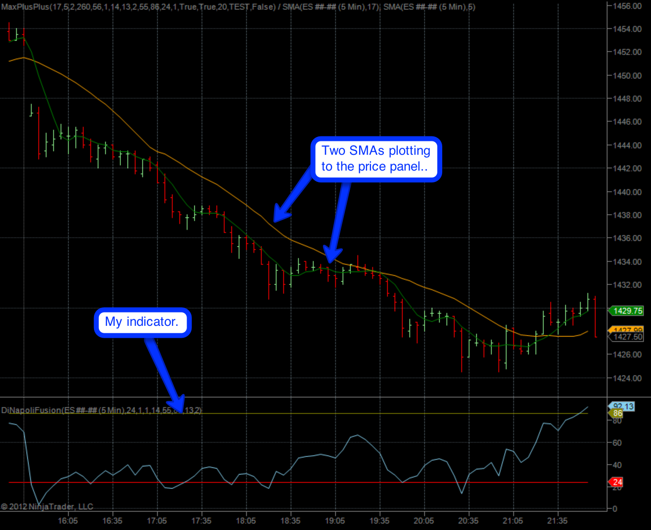 I'm trying to have my indicator plot the BB on the price panel as usual and the MACD in the indicator panel. Note that the modified BB plotting code, and modified MACD plotting code are inside my indicator code.