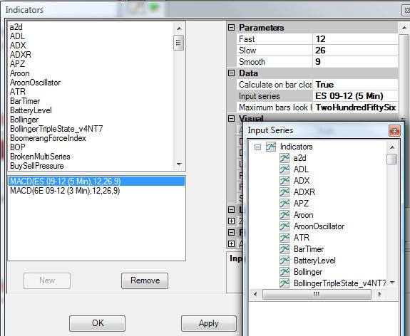 I am editing my MACD to change the input series, and it's already on the chart.Originally posted by light65536 View PostOkay, it looks like I can do that in the editor... seems a bit odd though that I can't just select the indicators that I've already put on chart but must create a new indicator.