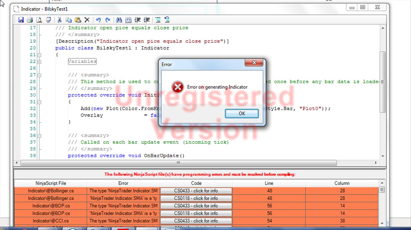 Attached is the error msg I get if I try to load another NJ script. There is no @SMA in my Documents -> NinjaTrader 7 -> bin -> Custom -> Indicators folder. There are other @ indicators there but not the @SMA.