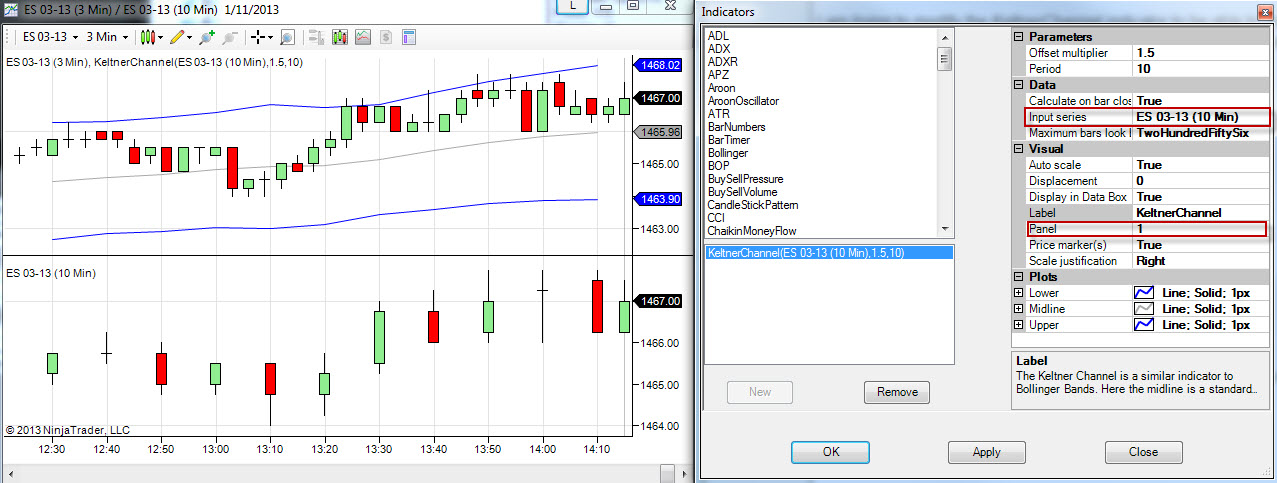 What I'm trying to do is use the pre-existing Keltner Channel indicator and plot 10 min Keltner channels on a smaller time frame.