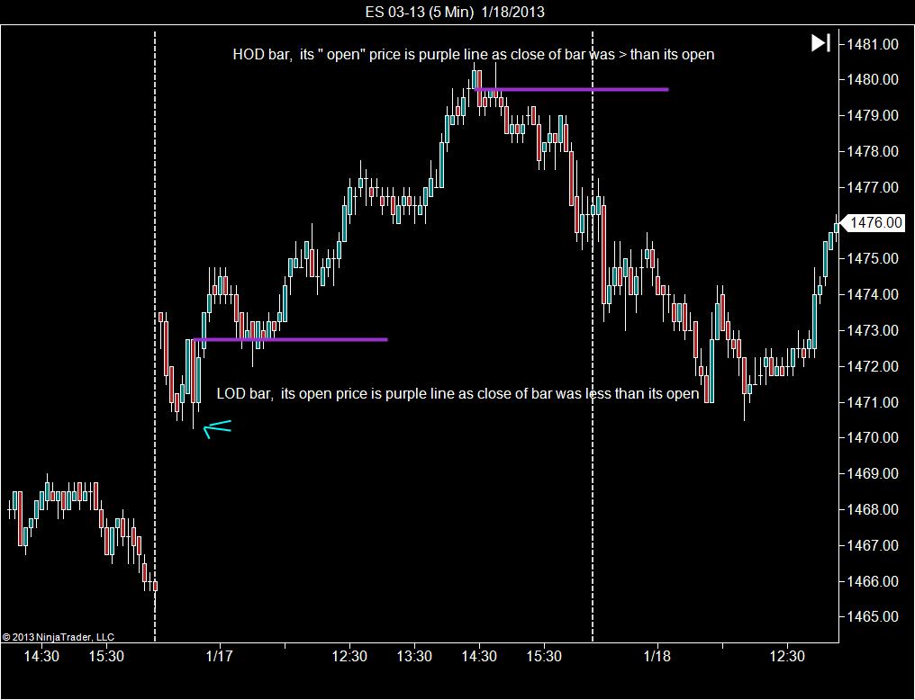 Now - as a filter - to plot a valid "open" price indicator line - for high of day bar - the close must be greater than open, and for low of day bar - the close must be less than open.