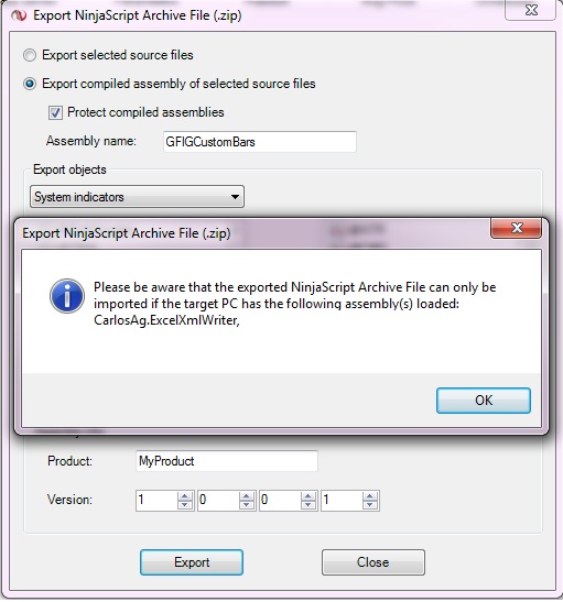 If so, then you need to create a clean development environment free of any custom assemblies. This can be as simple as shutting down NinjaTrader and renaming the (My) Documents\NinjaTrader 7 folder to something like MyNinjaTrader 7 > then restart NinjaTrader and then develop and export the files.