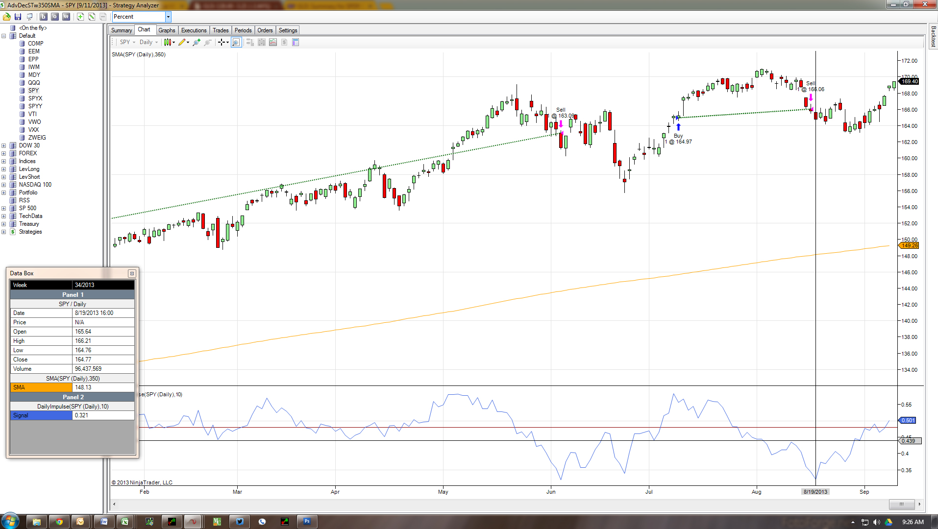Every setting matches EXCEPT for number of days, BUT why should that matter for an indicator that is only using a 10 day SMA? If one chart it 3650 days and the the Strategy Analyzer is 56 years, Sept 10, 2013 should equal the same thing, since I am only using the past 10 days, right?