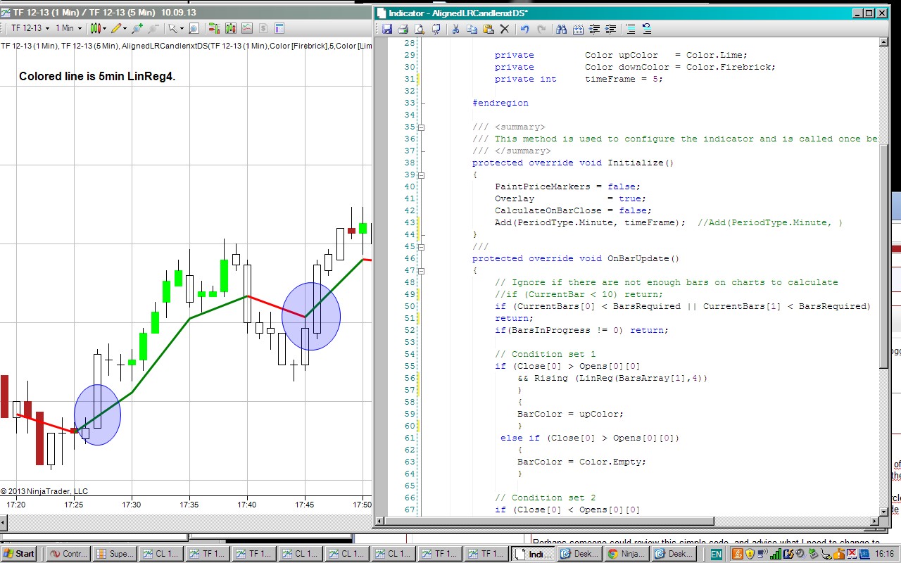 I have put together a simple indicator for me that colors a 1min candle when the LinReg4 of a higher time frame is rising or falling. It works but unfortunately too late. With that I mean the 1min candle seems to read the 5min LinReg4 condition only when the 5minutes are up and not when it is in progress. Hope this makes sense. To illustrate this point I have attached a chart image and circled the candles where I would expect a colored candle. Also included in the image is the code I use.