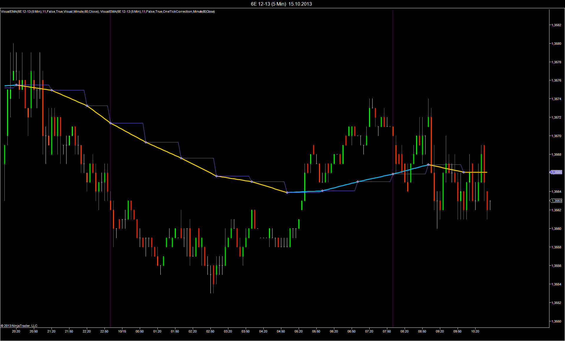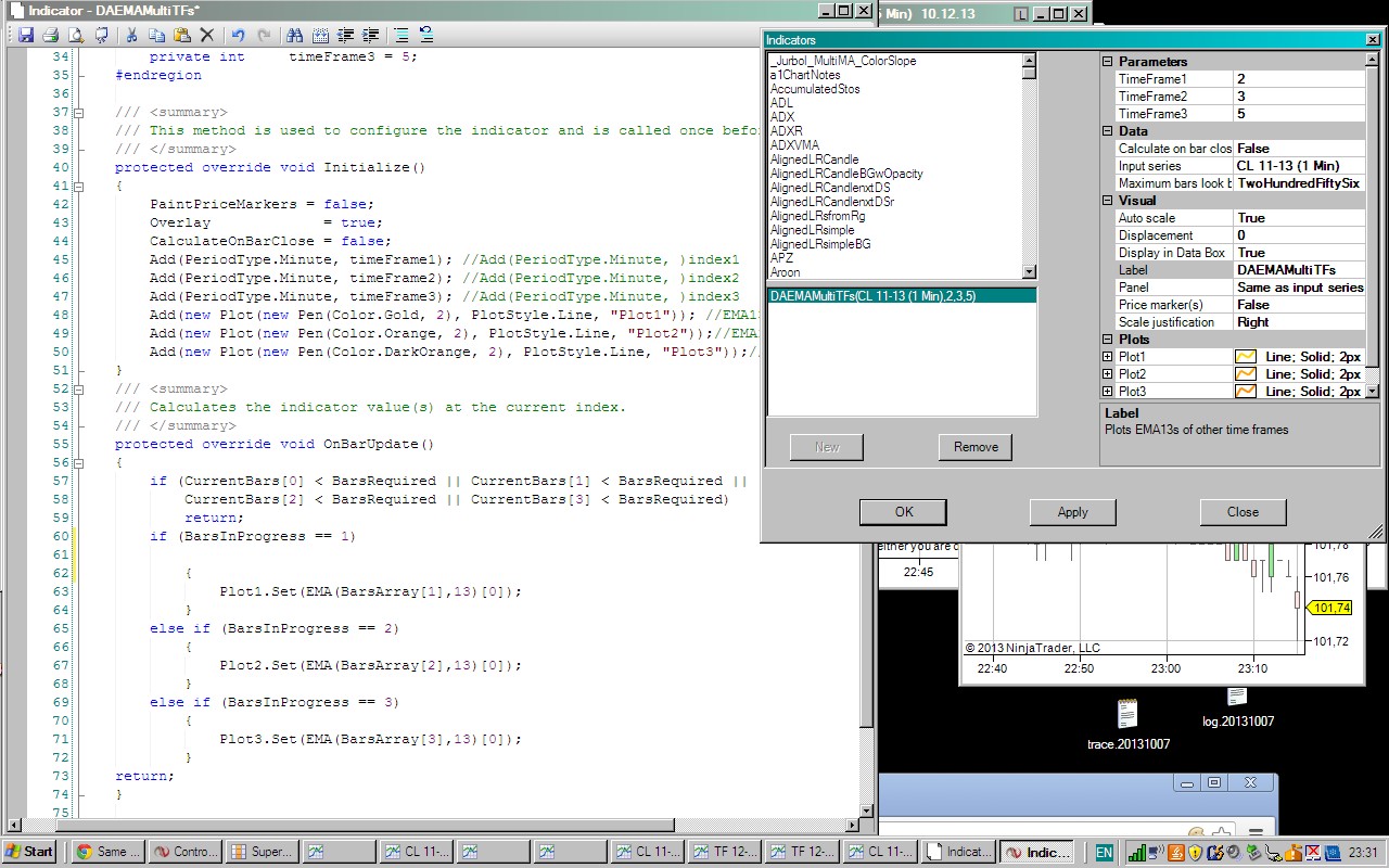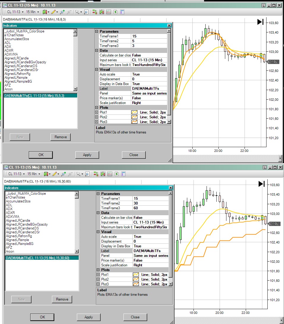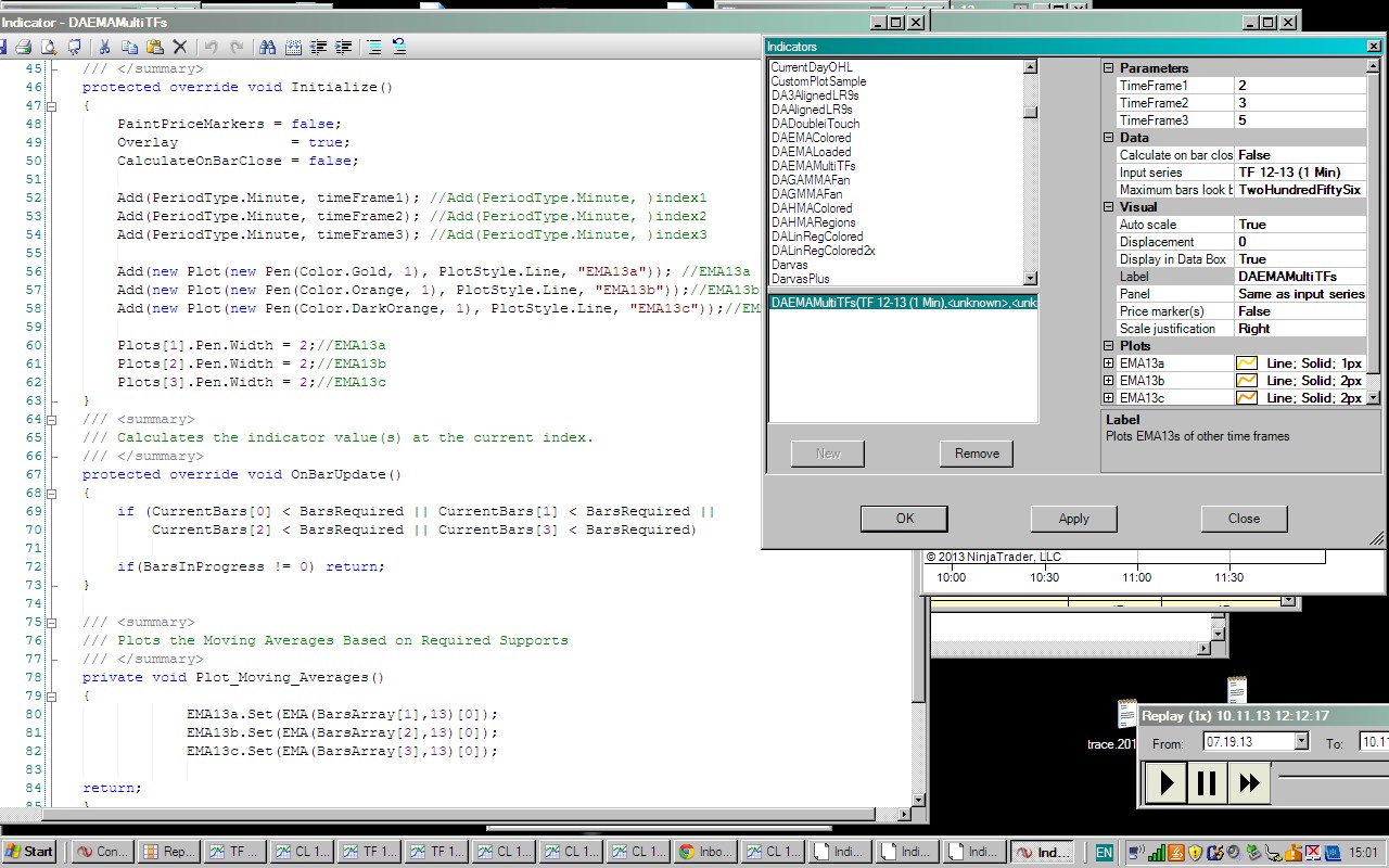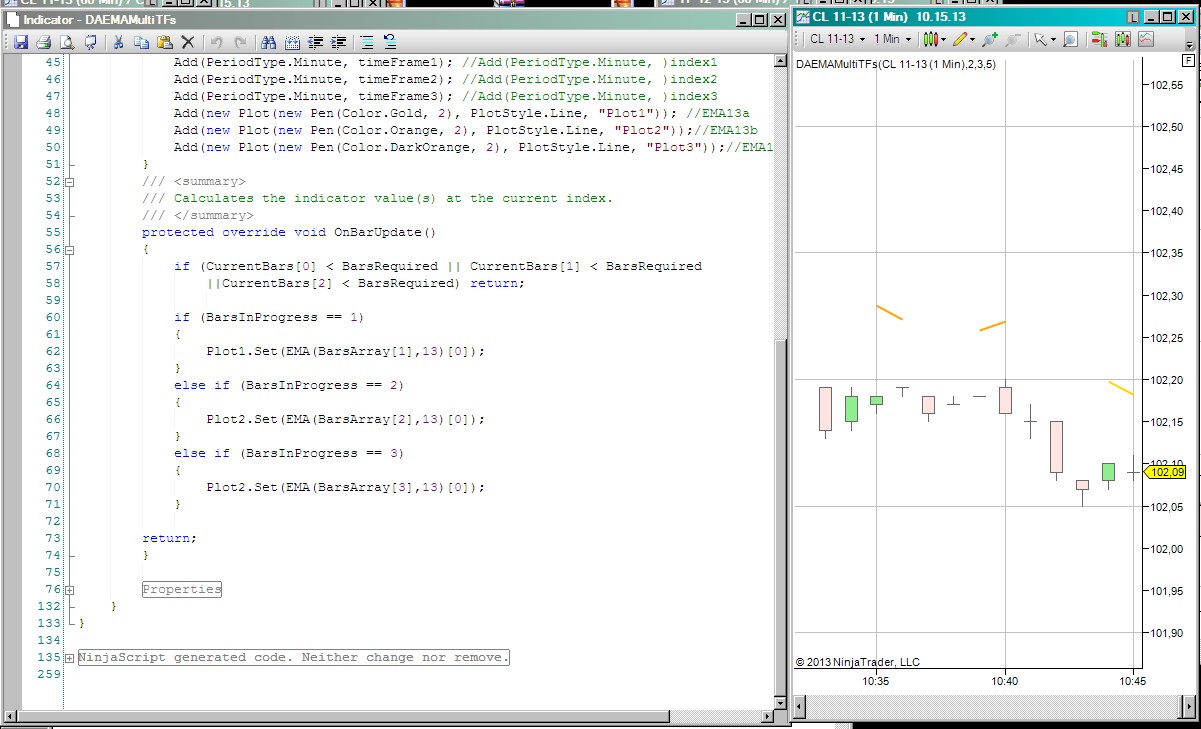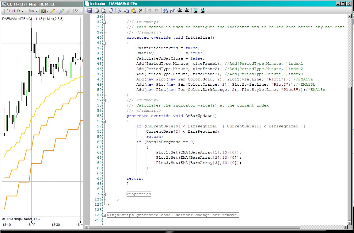 There is another multiple time frames indicator I am working on where I cannot get the lines to plot on the chart. What I am trying to do is by using only one DataSeries/InputSeries to plot the EMA of three additional timeframes. For example using a 1Min InputSeries and chart I want this indicator to plot a 13period EMA of the 2Min Data Series as well as a 13period EMA of the 3Min Data Series as well as a 13period EMA of a 5Min Data Series. The EMA is constant, the timeframes should be user definable as well as their individual colors.