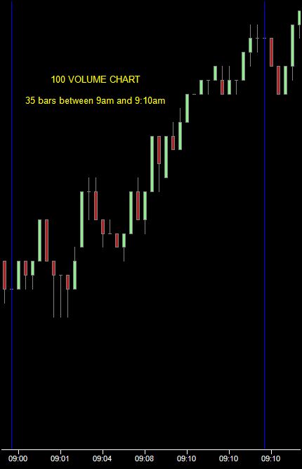 Pictured example, if I am using a 100 Volume Chart and I want to determine the total number of bars that have printed from 9am to 9:10am.