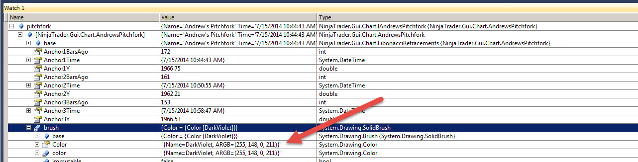 Then here is the line I Draw a line on trying to use the color of the pitchfork that does not do what I want. I have also attached a screen shot of the watch variable structure pointing to the field that has what I want.
