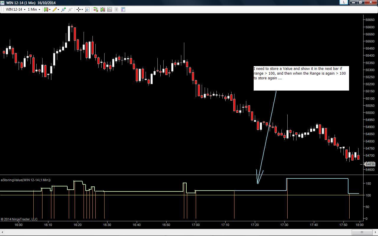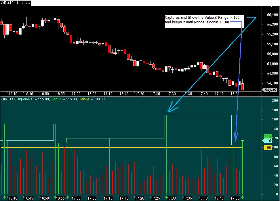 I want to plot a straight Line if Range is greater than 100 . This line would be in the same indicator panel as the Range indicator at the Value of the Range that is > 100. So if the Range is 120 , it would show a line with the 120 value. If the next bar the Range is less than 100 it would still plot 120. If instead, the next bar Range is 110, it would Plot a Line at the 110 Value.