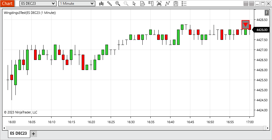 To test to see if the behavior is being caused by other addons on your platform, please create a clean environment by following the steps below. Then open a New > Chart window for ES 12-23 1-Minute with no other indicators, custom barstypes, or addons applied to the chart. Import the Wingdings3Test script attached in post # 9, and add the indicator to the chart to see if the behavior persists.