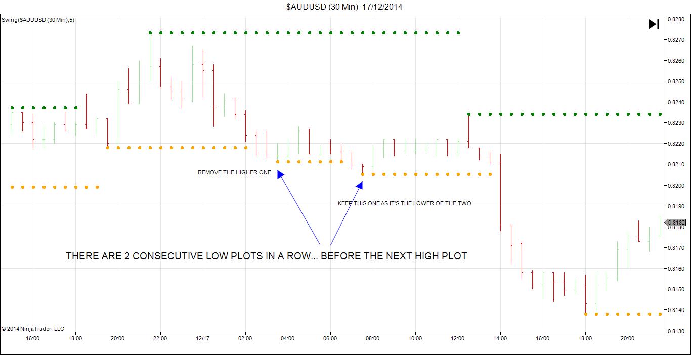 Ok so as you can see in the pic, the swing indicator has plotted two lows in a row before another high...I don't wont this to happen... I want the higher of the 2 lows removed..