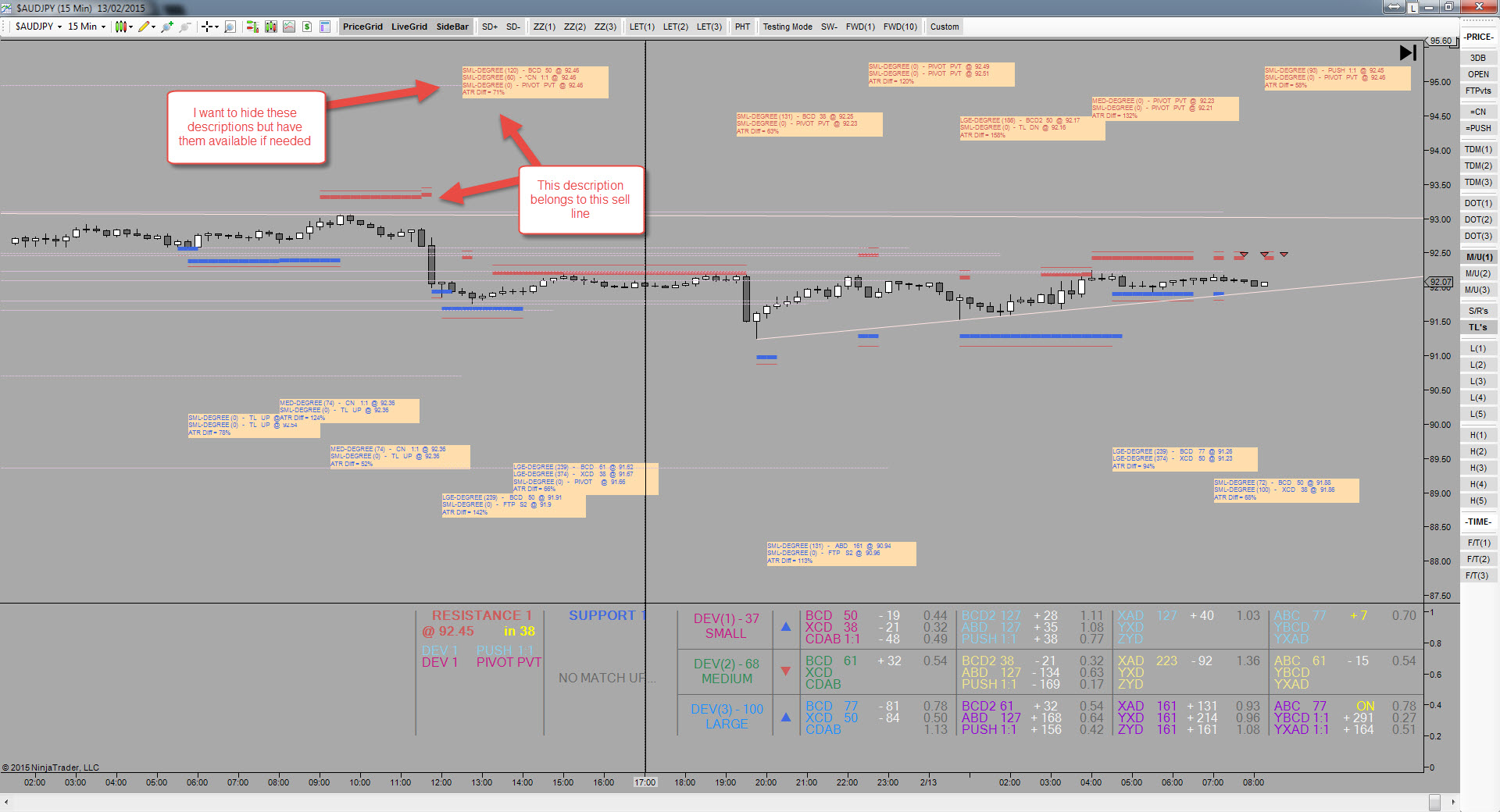 I have an indicator that prints historical buy and sell lines on the chart as shown on the screenshot. Each buy and sell line has attached to it the reasons for the trade which is a few lines of text. I would like have this text available to view however I dont want it clogging up the chart and overlapping each other etc