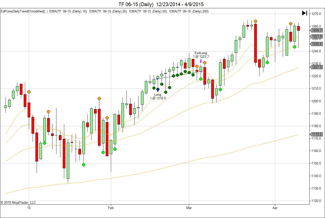 In the example daily chart you can see various orange and lime green dots, these are where price closes above/below the EMA(10) which is your exit condition (if you were in a trade). The dark green dots show the 10 bars above EMA(10), which repeated 11 days in a row.