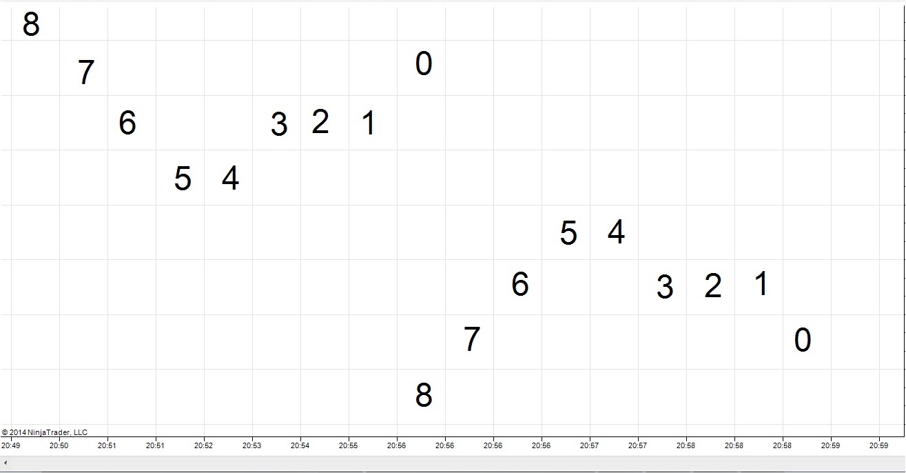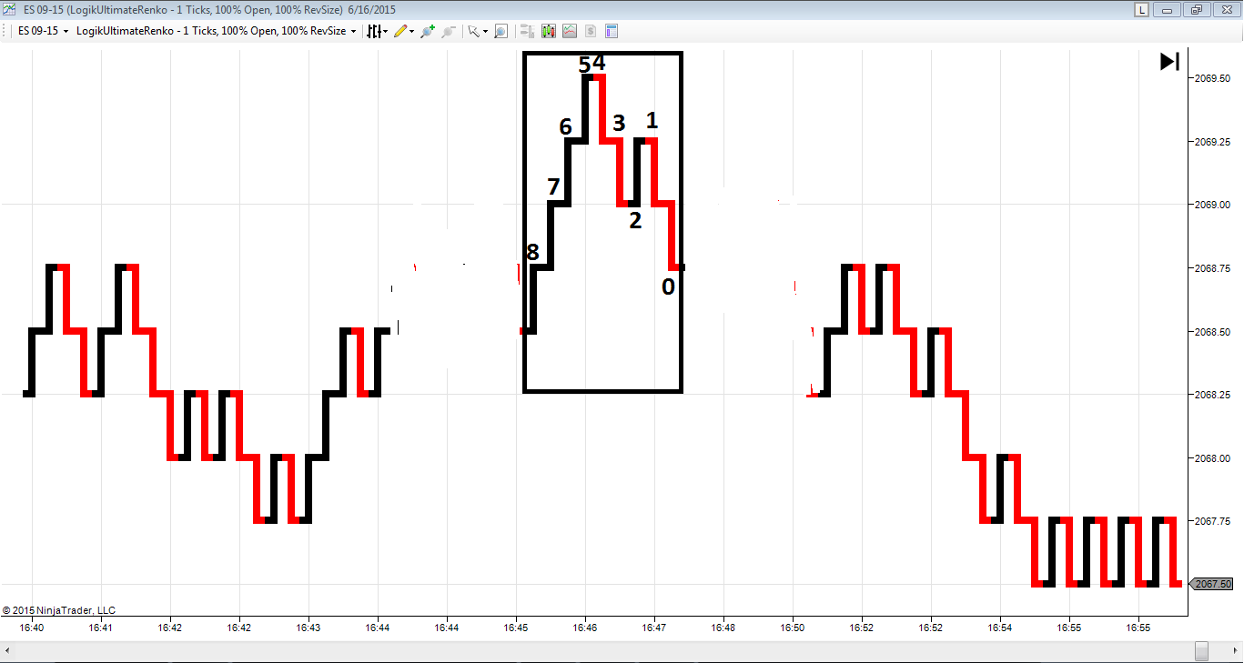 in the image you`ve attached - the fib based pattern.However,my idea was to use one tick range chart(meaning a number on the image is equal to 1 tick range bar),and just to connect the Highs/Lows/Close dots.