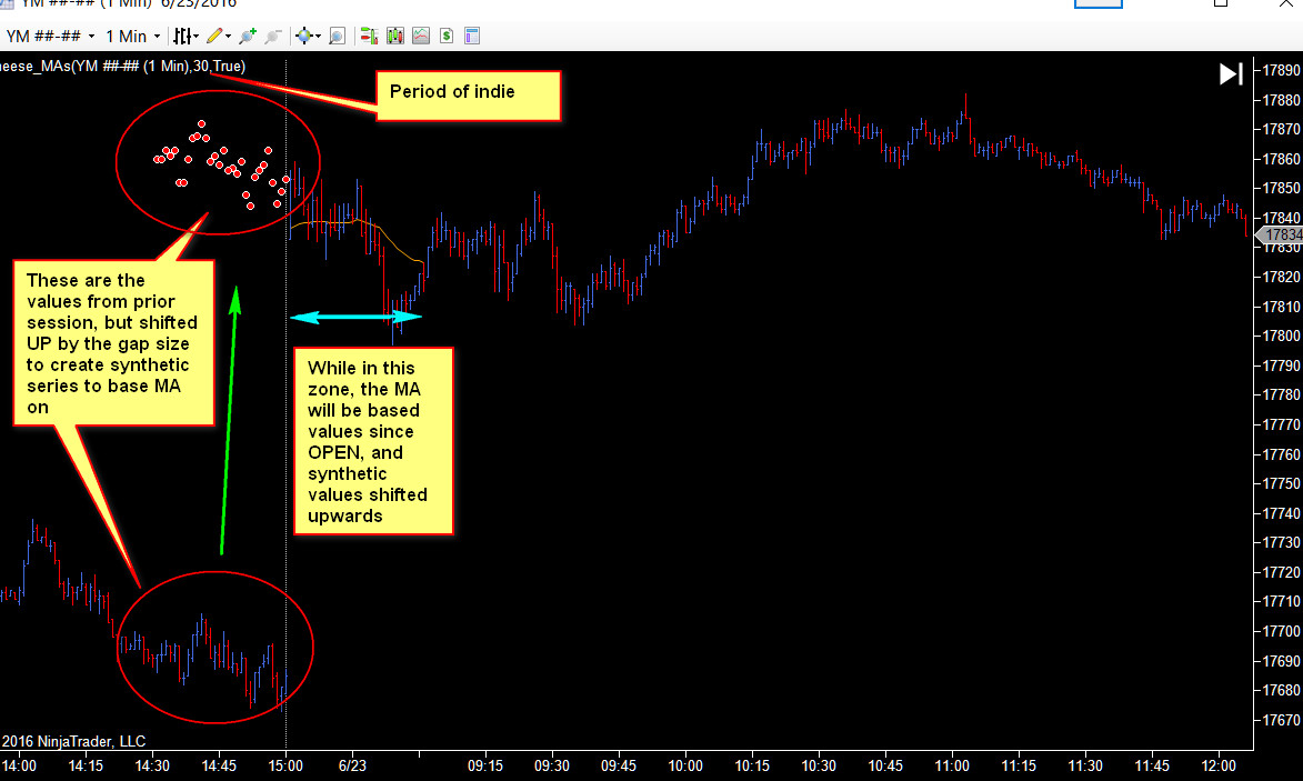 Then the plotting, is simply set based on the number of bars since the session start, so if the number of bars is LESS than the period chosen, the MA is built with the synthetic session. If GREATER, it is built with the closing price as is normally the case.